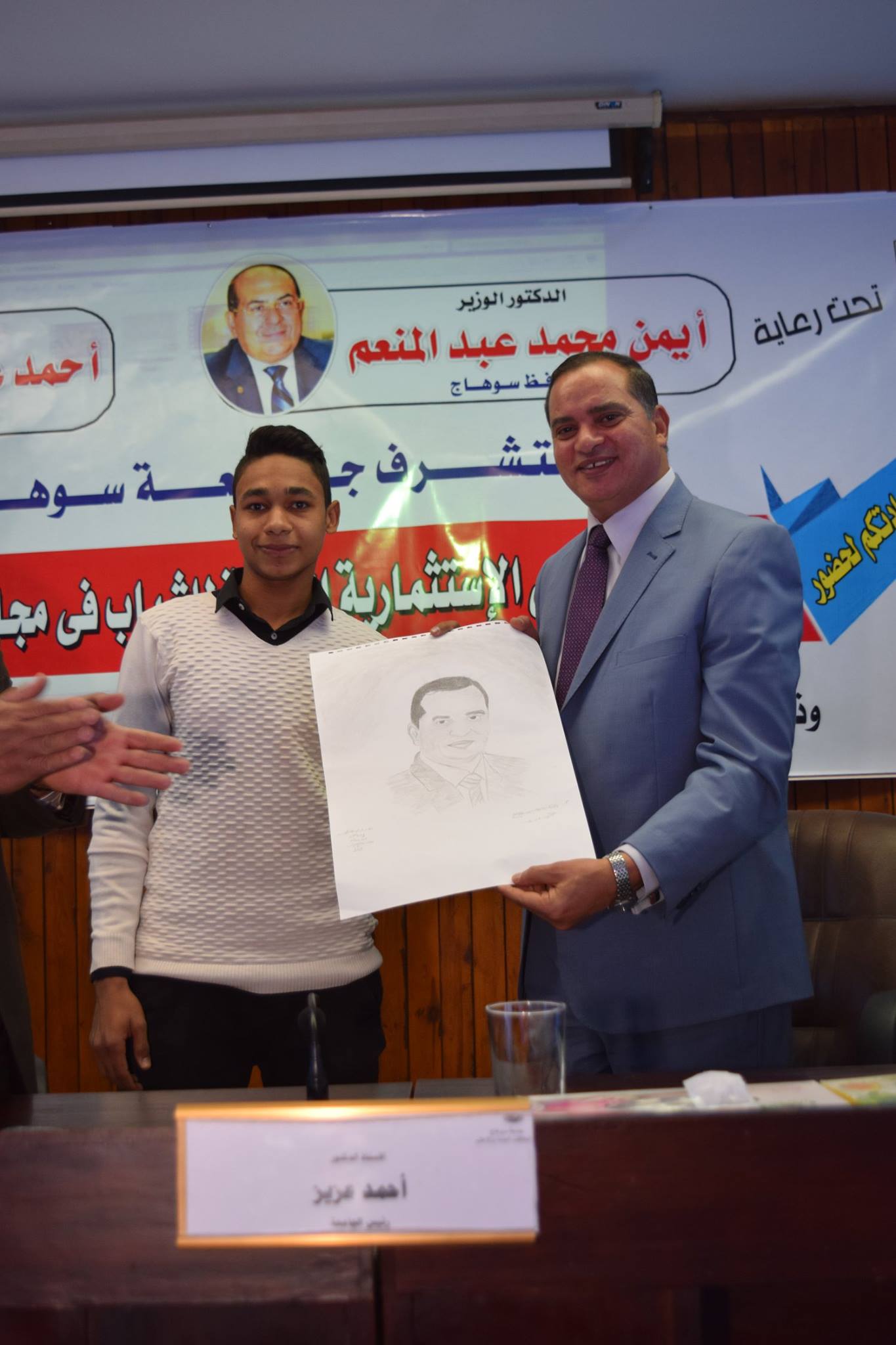 الطالب احمد فرج الفرقة الثانية قسم انتاج حيوانى بالكليه يهدى الاستاذ الدكتور احمد عزيز عبد المنعم رئيس الجامعة بورترية من اعماله.