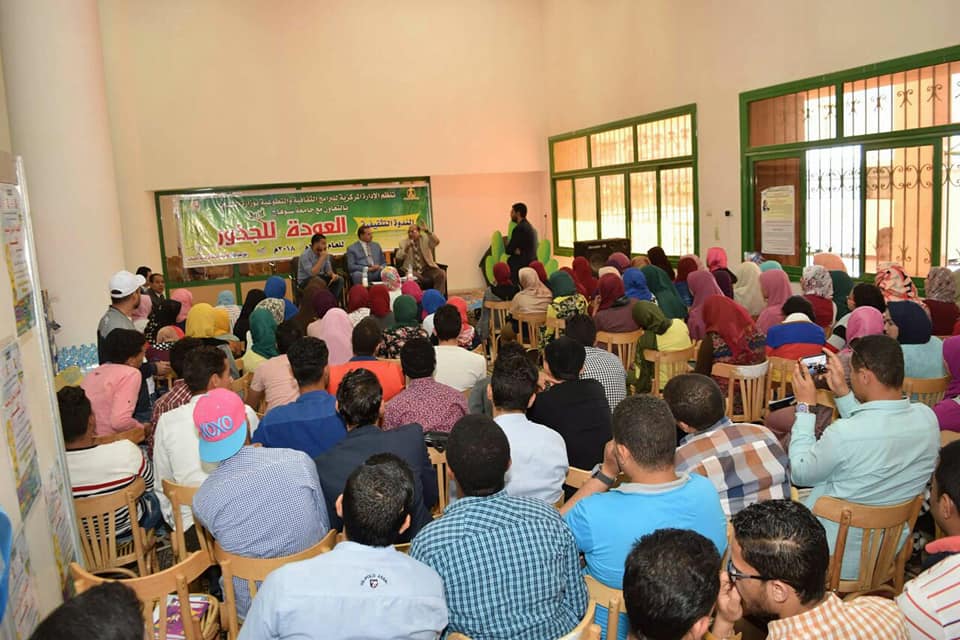 نظمت جامعة سوهاج ندوة تثقيفية بعنوان ” العودة للجذور ” وذلك اليوم الاحد 11 مارس 2018 بمقر الجامعة الجديدة، صرح بذلك د. أحمد عزيز عبدالمنعم رئيس الجامعة، وقال في كلمته إن الندوة تأتي في إطار اهتمام الجامعة بالنشاط والجانب الثقافي والتوعوي والذي له أثر كبير في تطوير شخصية وأفكار الطلبة والطالبات . وأضاف د احمد عزيز أن الجامعة تتطلع إلي مزيد من تلك الندوات والفعاليات التثقيفية خاصة مع قرب افتتاح قاعة المؤتمرات الكبري ” قاعة قناة السويس ” بشكل رسمي، مما سوف يسهم في خلق حالة من الحراك الثقافي الفعال داخل الجامعة . وأوضح د. صفا محمود السيد نائب رئيس الجامعة لشئون التعليم والطلاب أن الندوة والتي جاءت بالتعاون مع الإدارة المركزية للبرامج الثقافية والتطوعية بوزارة الشباب والرياضة قد حاضر بها الشاعر الكبير جميل عبدالرحمن والحاصل علي جائزة الدولة التقديرية بصالة معرض الكتاب . من الجدير بالذكر أن رئيس الجامعة اقترح علي الطلبة والطالبات من الحضور توجيه الأسئلة والاستفسارات التي تشغلهم, وبدوره قام بالإجابة عنها في حالة من التفاعل، أعقب ذلك مشاركة عزيز للفريق الموسيقي بالجامعة في عرضهم الفني علي هامش الندوة .