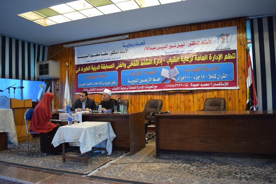 انطلقت اليوم المسابقة الكبرى في حفظ القرآن الكريم والحديث الشريف، التي تنظمها رعاية الشباب المركزية ادارة النشاط الثقافي بقاعة المؤتمرات الزجاجية، صرح بذلك الدكتور نبيل نور الدين عبداللاه رئيس الجامعة.