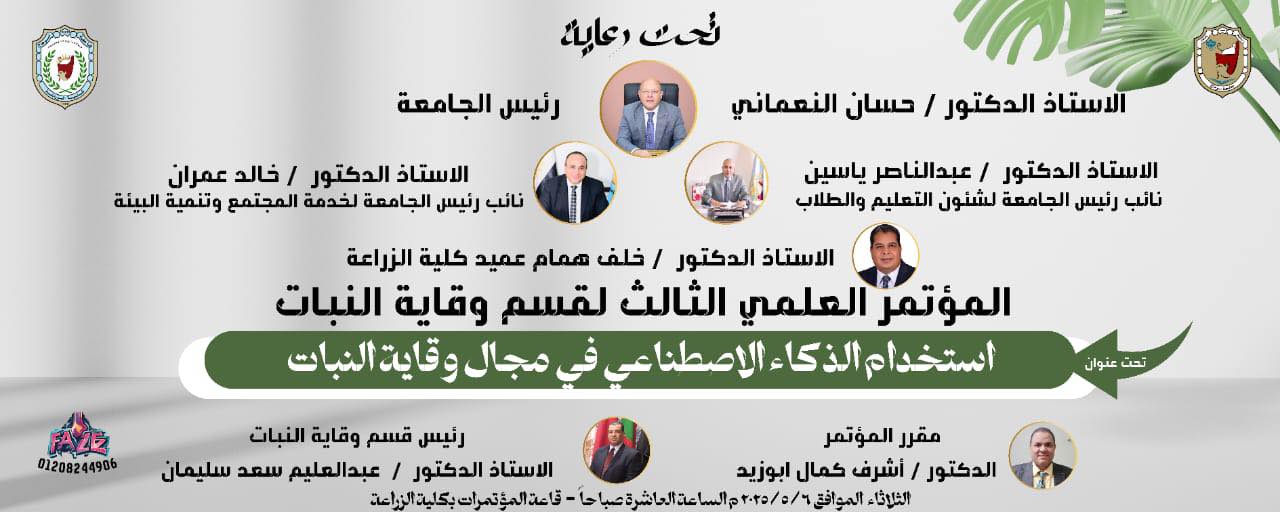 تحت رعاية الاستاذ الدكتور/ حسان النعماني – رئيس جامعة سوهاج، نظم قسم وقاية النبات بكلية الزراعة مؤتمره العلمي الثالث، تحت عنوان ” استخدام الذكاء الاصطناعي في مجال وقاية النبات” بحضور الدكتورهاني احمد فؤاد – وكيل الكلية لشئون التعليم والطلاب و الدكتور عبدالعليم سعد سليمان رئيس قسم وقاية النبات ورئيس المؤتمر والدكتور اشرف كمال ابوزيد مقرر المؤتمر، ونخبة من أعضاء هيئة التدريس بالكلية والقسم والفريق البحثي لمعهد بحوث وقاية النبات بمركز البحوث الزراعية، ومركز بحوث الصحراء، والسادة معاوني هيئة التدريس، وطلبة الدراسات العليا، وطلبة قسم وقاية النبات.