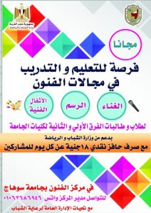 قال أحمد عاطف مدير إدارة النشاط الثقافي والفني بالإدارة العامة لرعاية الشباب أن الجامعة أتاحت فرصة للتعليم والتدريب في مجالات الفنون بالمجان، وذلك بدعم من وزراة الشباب والرياضة لطلاب وطالبات الفرق الأولي والثانية بكليات الجامعة المختلفة .