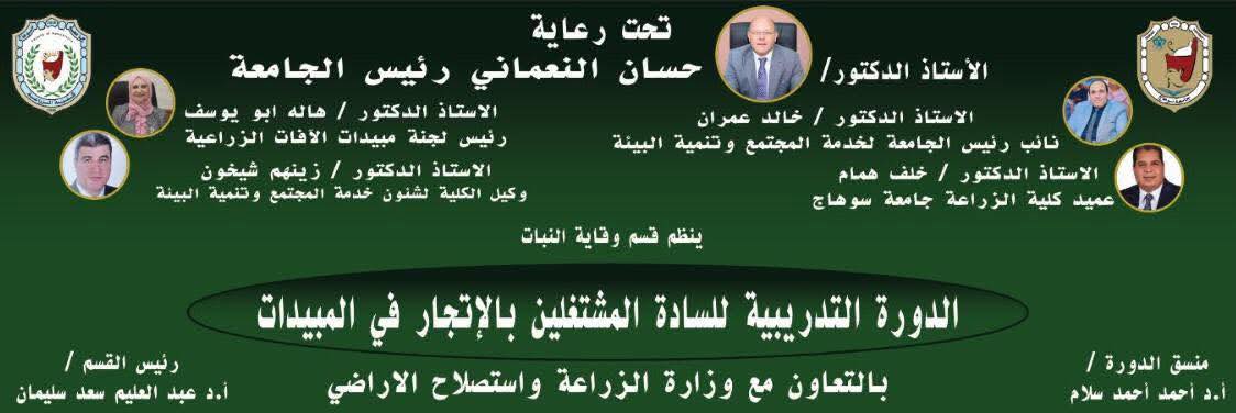 نظمت كلية الزراعة بجامعة سوهاج، تحت رعاية الأستاذ الدكتور حسان النعماني رئيس الجامعة، والأستاذ الدكتور خالد عمران نائب رئيس الجامعة لشئون خدمة المجتمع وتنمية البيئة، والأستاذ الدكتور خلف همام عميد الكلية، الدورة التدريبية للسادة المشتغلين بالاتجار في المبيدات، وذلك بالتعاون مع وزارة الزراعة واستصلاح الأراضي.