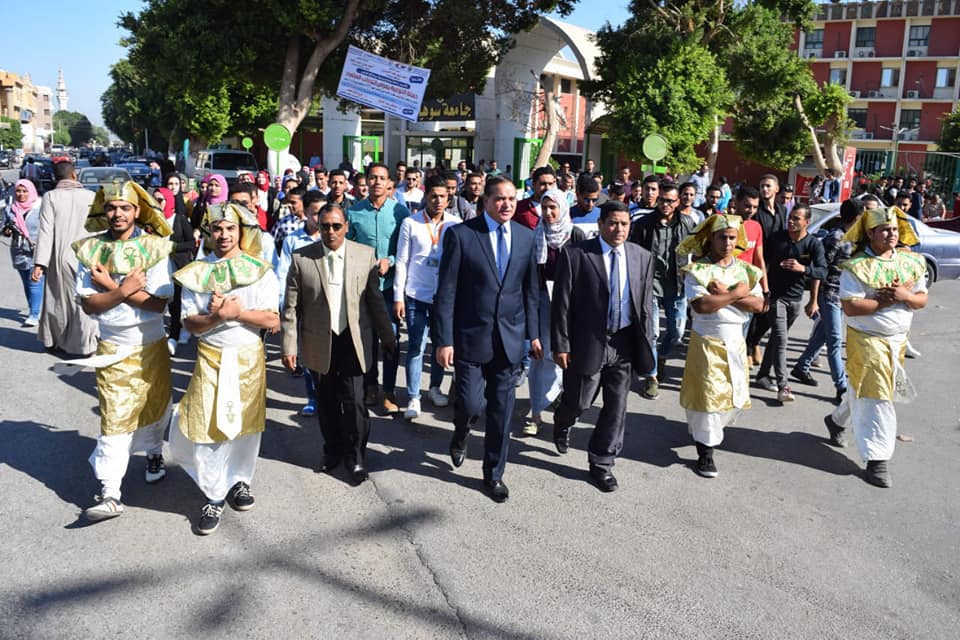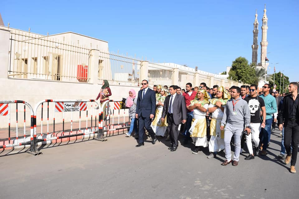 انطلقت صباح اليوم الاثنين مسيرة جامعة سوهاج لدعم وتنشيط السياحة، تقدمها الدكتور احمد عزيز رئيس الجامعة والدكتور محروس محمود عميد كلية التربية الرياضية والدكتور سمير ابو المجد بكلية الحقوق والدكتور احمد الأنصاري وكيل كلية الاثار وعدد من طلاب كلية الحقوق والتي نظمتها أسرة روح القانون بالكلية ، بدات المسيرة من امام بوابة الجامعة الرئيسيّة وحتي متحف سوهاج القومي، حيث كان في استقبالها كلا من عبد اللطيف ابراهيم وحسن علي مديري المتحف والدكتور علاء القمحي وكيل المتحف واحمد فراج مدير عام التوثيق الأثري لمتاحف الوجه القبلي.