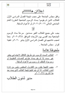 وافق مجلس الجامعة على حجب نتيجة الفصل الدراسي الأول للطلاب الذين لم يقوموا بسداد الرسوم الجامعية المقررة للعام الجامعي الحالي 2019/2020م أو الأعوام السابقة.
