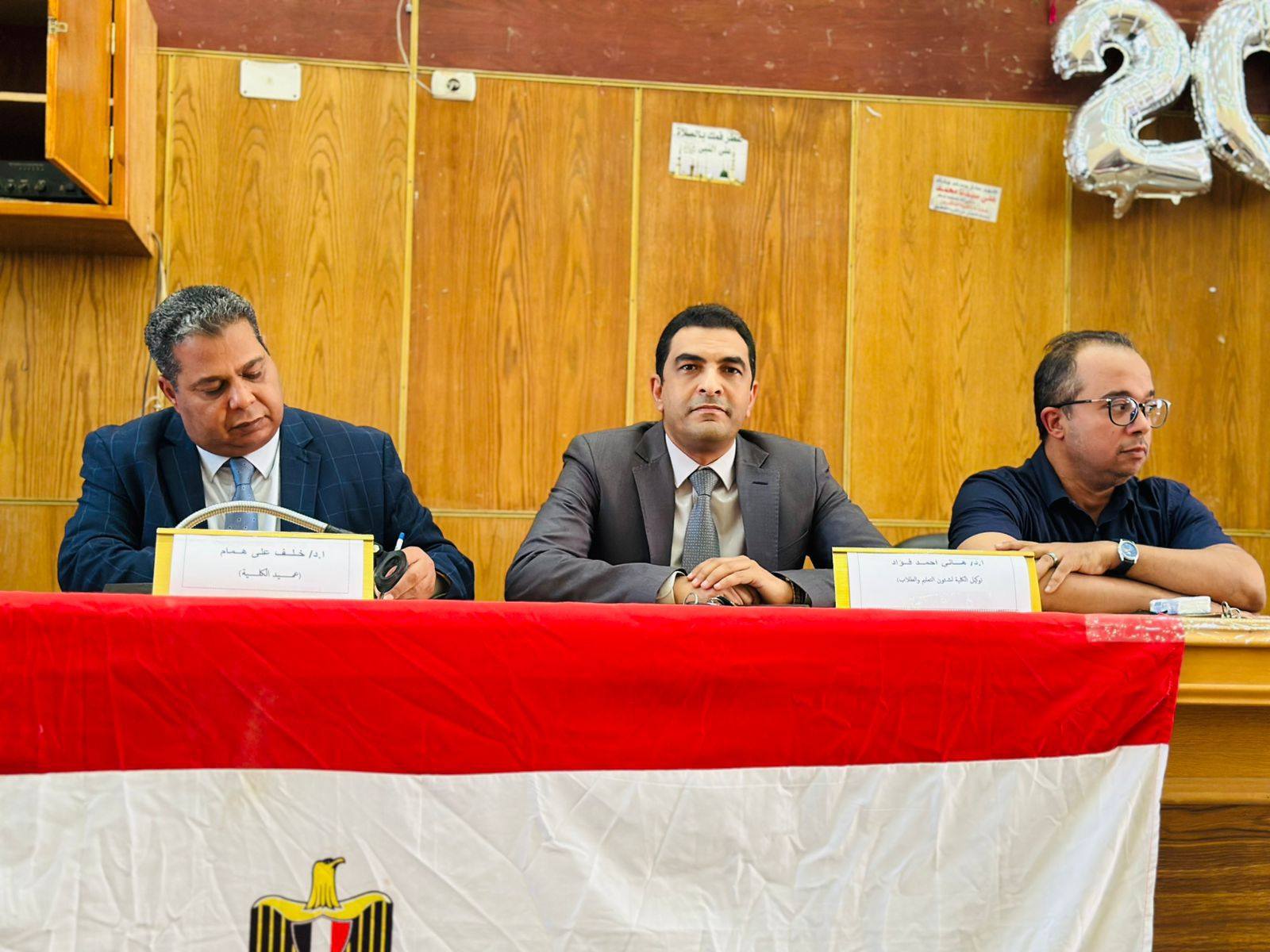وحضور الاستاذ الدكتور / هانى احمد فؤد وكيل الكلية لشئون التعليم والطلاب والاستاذ الدكتور / زينهم شيخون وكيل خدمة المجتمع وتنمية البيئة ورؤساء الاقسام وامين الكلية واعضاء هيئة التدريس والسادة الاداريين بالكلية