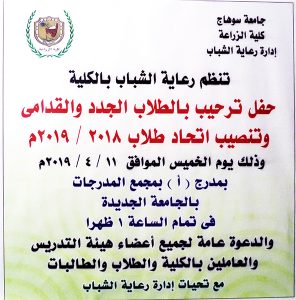 تحت رعاية معالي الوزير الأستاذ الدكتور احمد عزيز رئيس الجامعة ومعالى السيد الأستاذ الدكتور صفا محمود السيد نائب رئيس الجامعة لشؤن التعليم والطلاب والأستاذ الدكتور احمد سالمان عميد الكلية نظمت رعاية الشباب بالكلية حفل ترحيب بالطلاب الجدد والقدامى و تنصيب الاتحاد بالكلية وكذلك ندوة تعريفية حول التعديلات الدستورية وأهميتها وذلك يوم الخميس الموافق 11 أبريل 2019 بمجمع المدرجات بالجامعة الجديدة بمدينه سوهاج الجديدة.