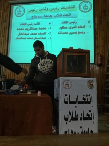 أعلن الدكتور نبيل نور الدين عبداللاه، رئيس الجامعة، عن انتهاء المرحلة الأخيرة من الانتخابات الطلابية والتي أسفرت عن فوز الطالب أدهم قدري مطاوع، الفرقة الخامسة طب بشري، بمنصب رئيس اتحاد طلاب الجامعة بعدد 121 صوتاً، بينما فاز الطالب محمد عبدالكريم محمد كلية الطب البيطري بمنصب نائب رئيس الاتحاد بعدد 89 صوتاً، في الانتخابات التي أجريت اليوم بالاقتراع السري المباشر لمن لهم حق الانتخاب والذين يمثلون مجلس أتحاد طلاب الكليات وعددهم 224 طالب وطالبة، بقاعة المؤتمرات الكبري بالجامعة.