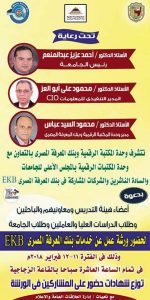 وقال د.محمود أبو العز مدير مركز الخدمات الإليكترونية والمعرفية بالجامعة، ان الورشة سوف يشهدها، د.صفا محمود السيد نائب رئيس الجامعة لشئون التعليم والطلاب، دمحمد حسن جادالله استشاري وحدة المكتبات الرقمية بالمجلس الأعلى للجامعات المصرية، د.محمود داوود منسق التدريب على بنك المعرفة المصري، ود.محمد خميس استشاري قواعد بيانات دار المنظومة لقواعد البيانات العربية.