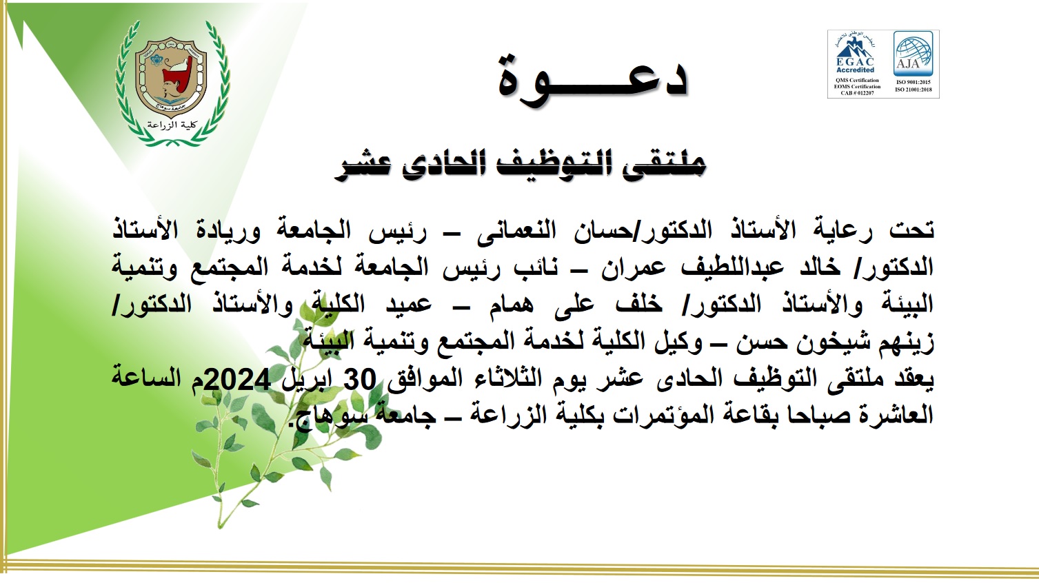 تحت رعاية الاستاذ الدكتور/ حسان النعمانى – رئيس الجامعة وريادة الاستاذ الدكتور/نائب رئيس الجامعة لخدمة المجتمع وتنمية البيئة والاستاذ الدكتور/ خلف على همام – عميد الكلية والاستاذ الدكتور/زينهم شيخون حسن – وكيل الكلية لخدمة المجتمع وتنمية البيئة يعقد ملتقى التوظيف الحادى عشر يوم الثلاثاء الموافق 2024/4/30م الساعة العاشرة صباحا بقاعة المؤتمرات بكلية الزراعة -جامعة سوهاج