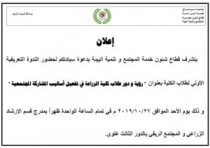 الرئيسية » Blog » ندوة تعريفية بعنوان:رؤية و دور طلاب كلية الزراعة فى تفعيل أساليب المشاركة المجتمعية