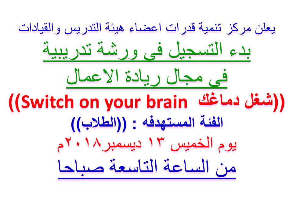 بناءا على موافقة السيد الاستاذ الدكتور / احمد عزيز – رئيس الجامعة على إقامة دورة تدريبية ورش عمل للطلاب فى مجال ريادة الاعمال، يقوم مركز تنمية قدرات اعضاء هيئة التدريس والقيادات الجامعية بعمل ورشة تدريبية فى مجال ريادة الاعمال ((شغل دماغك Switch on your brain)) لرفع مهارات الطلاب فى مجال ريادة الاعمال يوم الخميس 13 ديسمبر 2018م من 9 صباحا وحتى 3 عصرا للطلاب مع العلم ان العدد محدود وتكلفة… اقرأ المزيد »إقامة دورة تدريبية ورش عمل للطلاب فى مجال ريادة الاعمال