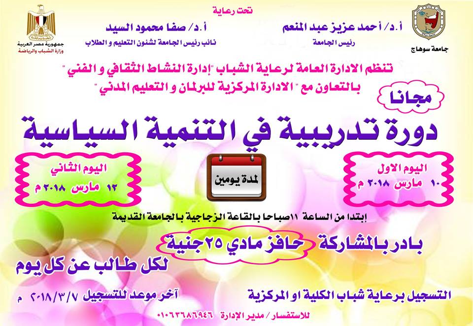 تنظم إدارة النشاط الثقافي والفني بالادارة العامة لرعاية الشباب بجامعة سوهاج ” دورة تدريبية في التنمية السياسية” بالتعاون مع الادارة المركزية للبرلمان والتعليم المدني، يومي 10، 12 مارس الجاري في تمام الساعة الحادية عشر صباحًا بالقاعة الزجاجية بالمقر الجامعي القديم . يذكر ان آخر موعد للتسجيل برعاية شباب الكلية أو المركزية يوم الاربعاء 7 مارس الجاري، إضافة إلي حافز مادي لكل طالب مشارك .
