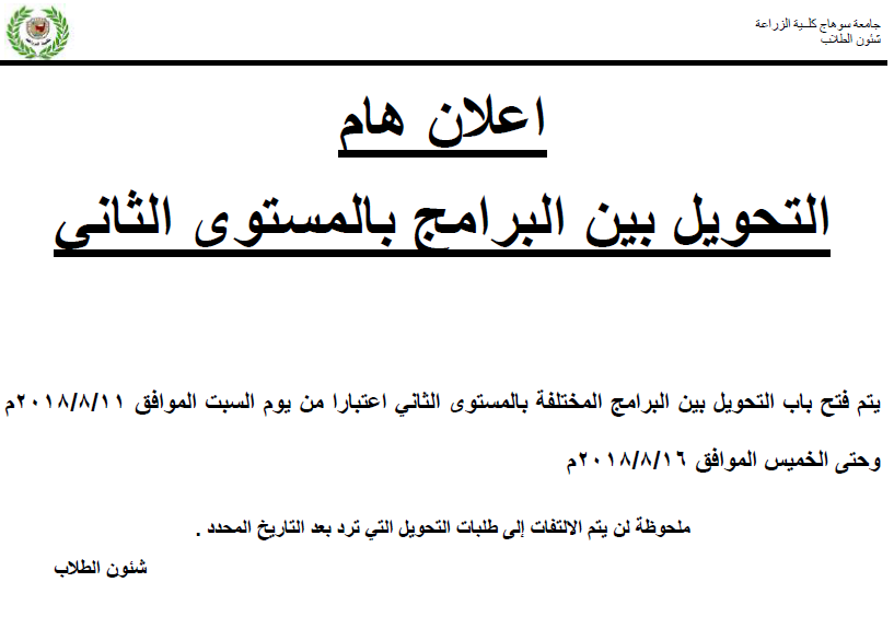 اعلان هام التحويل بين البرامج بالمستوى الثاني يتم فتح باب التحويل بين البرامج المختلفة بالمستوى الثاني اعتبارا من يوم السبت الموافق 11/8/2018م وحتى الخميس الموافق 16/8/2018م ملحوظة لن يتم الالتفات إلى طلبات التحويل التي ترد بعد التاريخ المحدد . شئون الطلاب