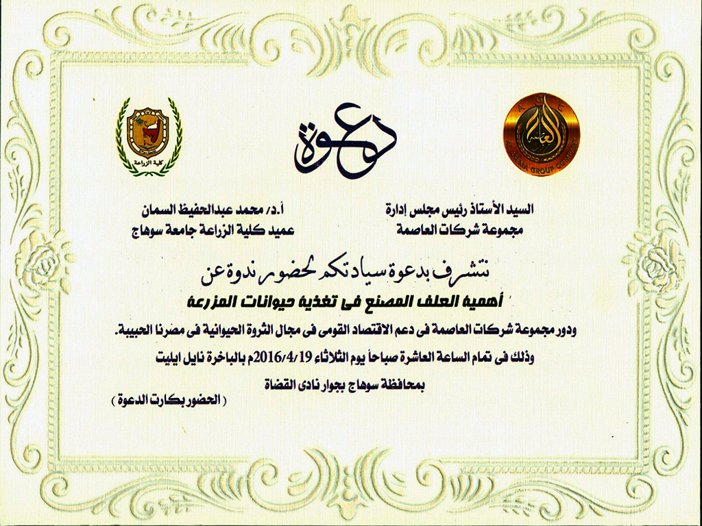 دعوة عميد الكلية لحضور ندوة”أهمية العلف المصنع فى تغذية حيوانات المزرعة”